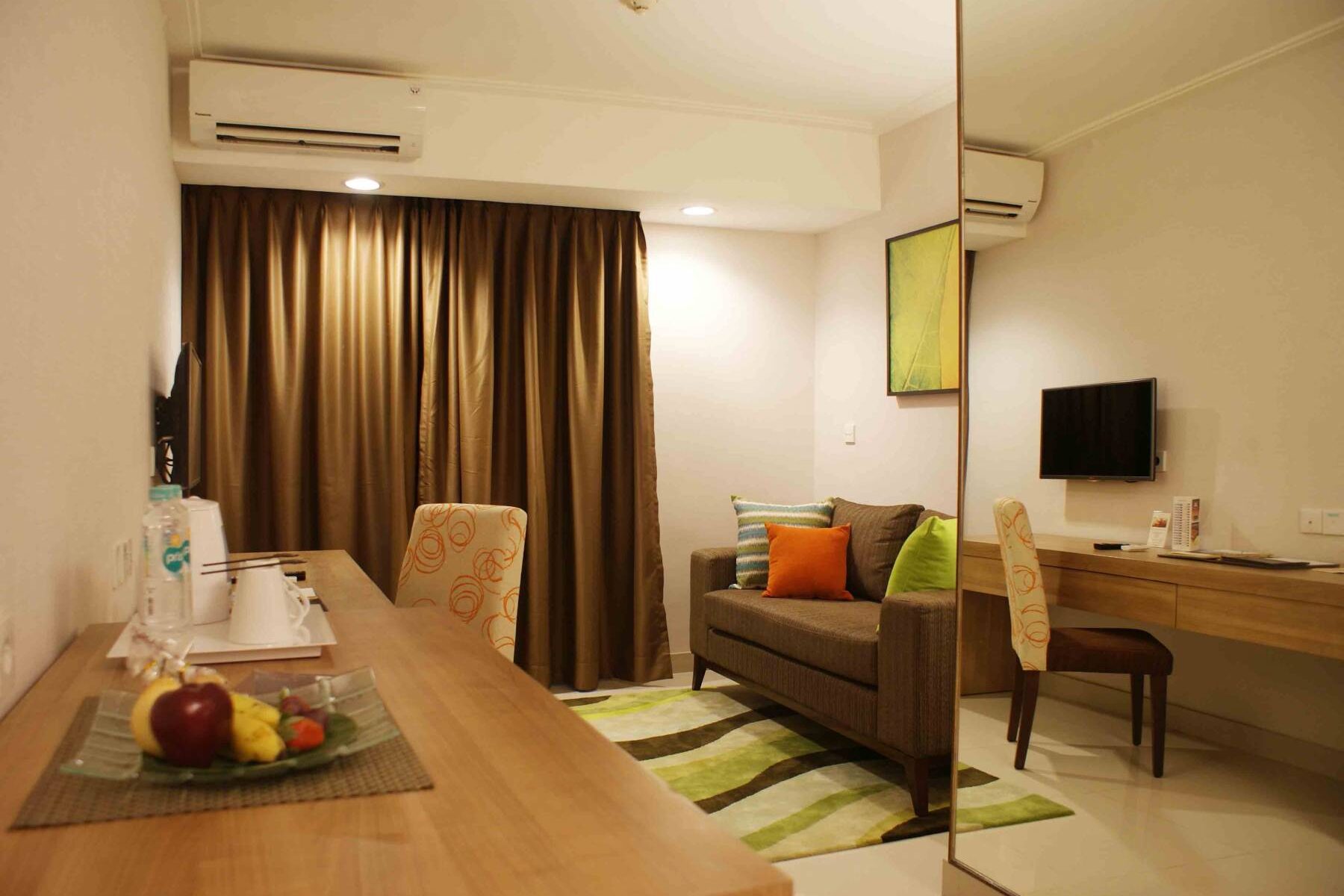 29 sqm spacious renovated room with 1 double bed with air-conditioned with individual thermostat, private balcony, dining room, living room, coffee & tea maker facility, LCD TV with 62 channels, safe deposit box and wifi internet connection.